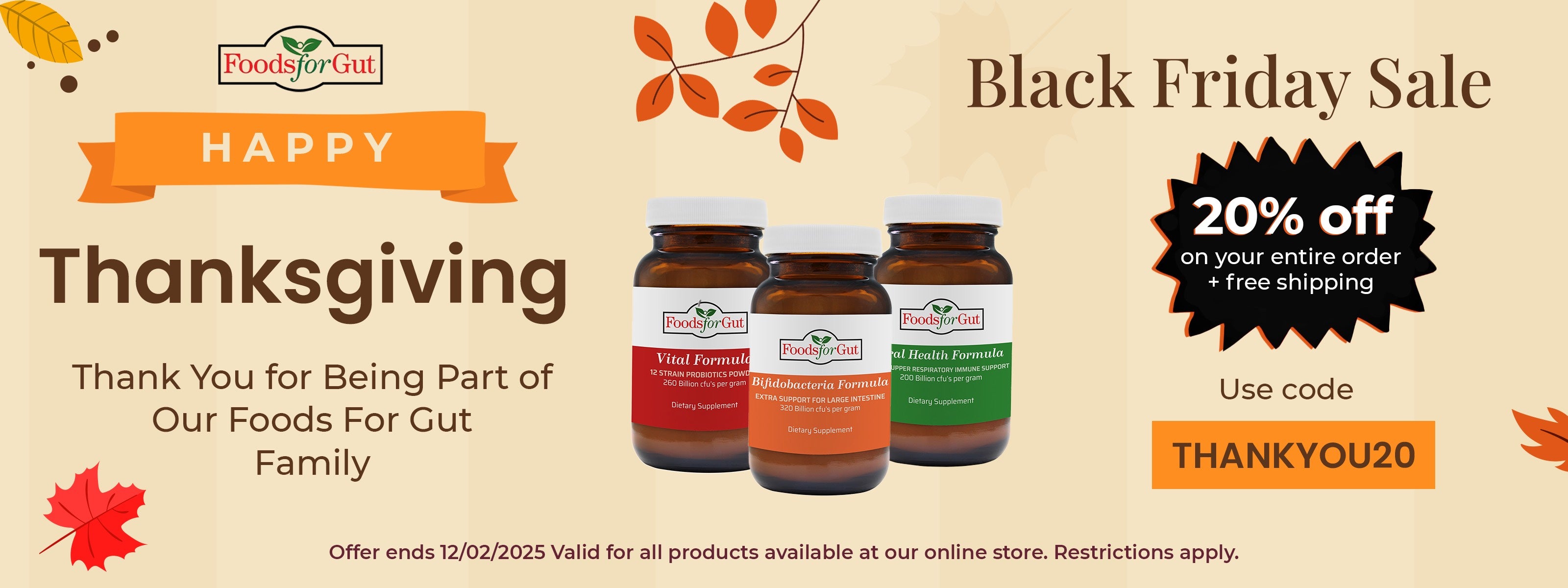 Join our mailing list and enjoy 10% off your entire order. As a subscriber, you’ll also receive exclusive updates on special promotions, limited-time sales, and new product launches throughout the year. Stay connected and be the first to know about everything Foods For Gut has to offer.